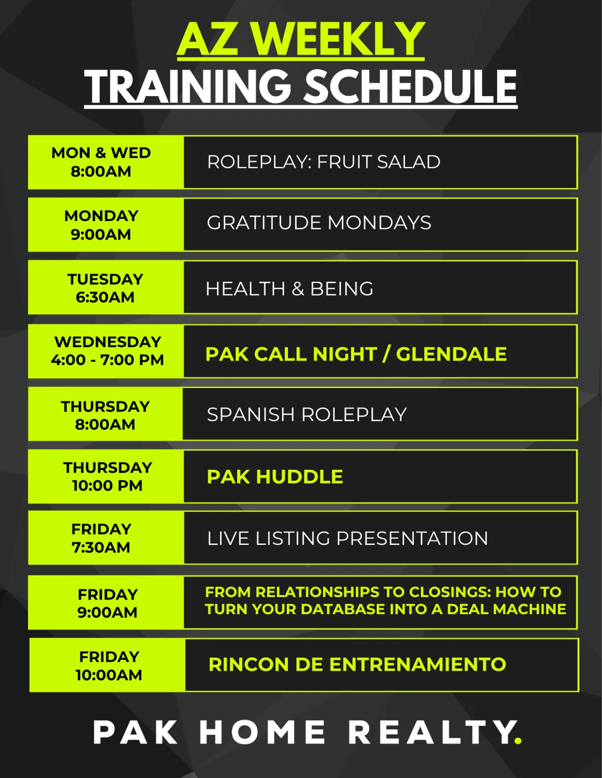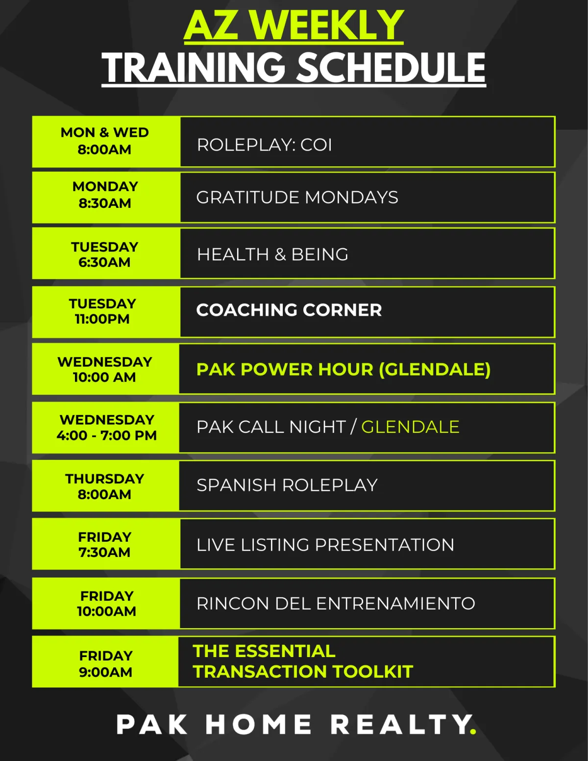 At Arizona PAK Home Realty, 2 of the core pillars we focus on is Education and Personal Growth. For that reason we encourage you to look at the calendar below get plugged into as many trainings and events as possible to experience what PAK is all about. Everything is designed to elevate your real estate skills. gain exclusive insights, actionable strategies, and connect with industry leaders to accelerate your professional and business growth.