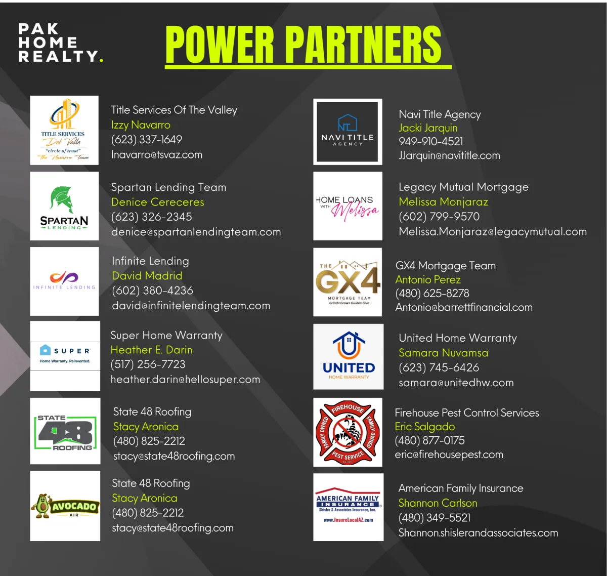 Our PAK Arizona Power Partners are more than trusted service providers they’re an essential part of our PAK Family. These industry-leading professionals support our agents with exceptional service, fast communication, and unmatched expertise across lending, title, insurance, roofing, pest control, home warranty, and more.